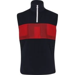 J Lindeberg’s Dean golf vest has lightweight Ripstop fabric at the front for wind protection and lightweight stretch fabric at back for movement with ease. In addition, the fabric is water repellent and moisture wicking to prevent sweat build up. Dean is equipped with zip pockets to secure valuables and features a big bridge logo at the chest. It offers quarter zip closure with a zip through stand collar for addition coverage.